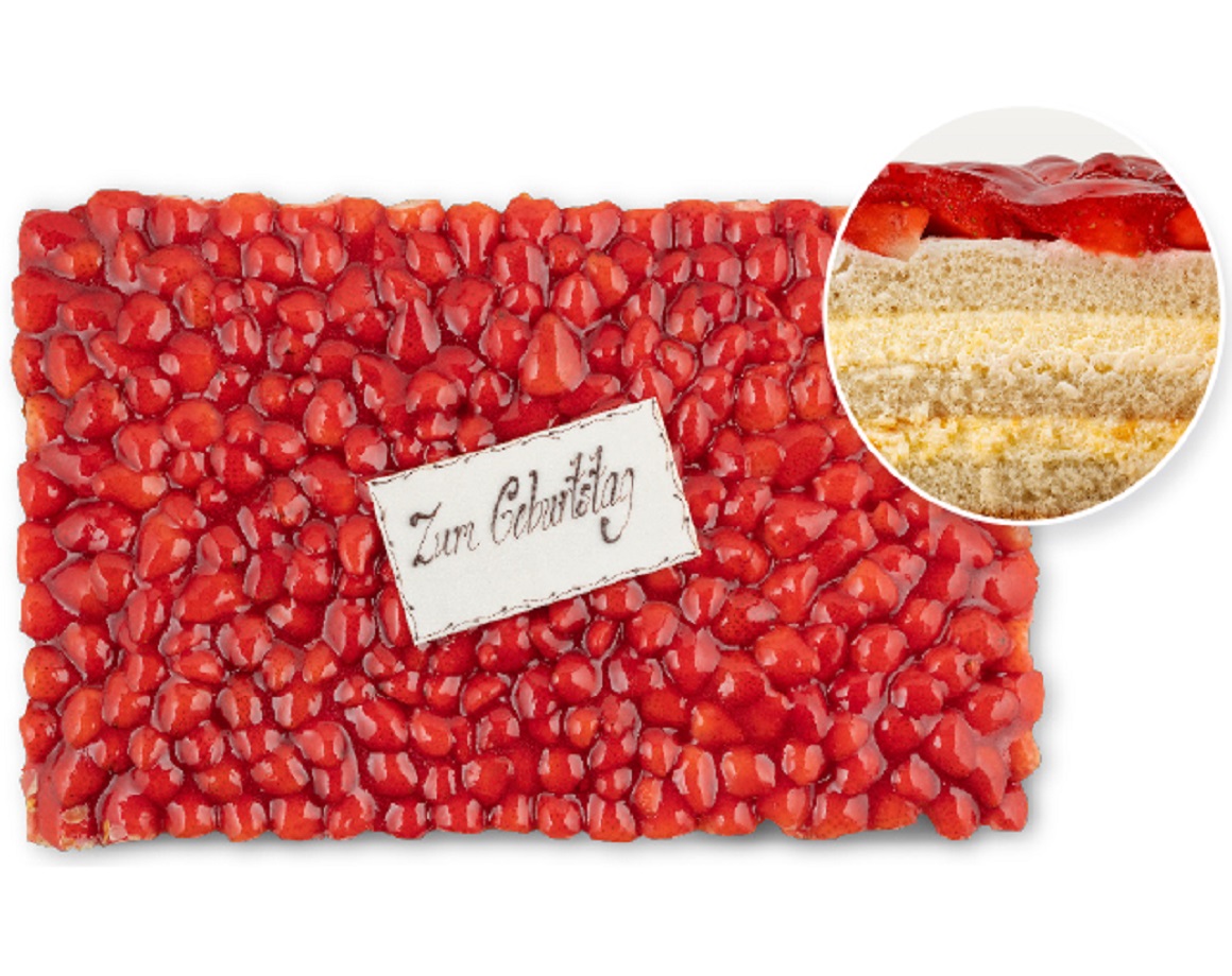 Erdbeeren 25,7%, RAHM (Schweiz), Wasser, Zucker, WEIZENmehl (Schweiz), EIER (aus Bodenhaltung), WEIZENstärke, Zucker (Schweiz), MANDELN 1,5%, Aroma, MagerMILCHpulver, Malzmehl (aus GERSTE), Modifizierte Wachsmaisstärke: E1412, Verdickungsmittel: E415, modifizierte Maisstärke, Backtriebmittel: E500, Rapsöl, Rapsfett gehärtet, Glukose, Backtriebmittel: E341, Backtriebmittel: E450, Stabilisator: E450a, WEIZENprotein, Geliermittel: Pektin, Konzentrat aus Karotten, Konzentrat aus schwarzer Johannisbeere, Zitronensaft aus Konzentrat, Erdbeersaft aus Konzentrat, Säuerungsmittel: Zitronensäure, Sonnenblumenöl, Säuerungsmittel: E331, Säuerungsmittel: E333, Konservierungsstoff: E202, Geliermittel: E407, Gelier- und Verdickungsmittel: Johannisbrotkernmehl, Erdbeeraroma
